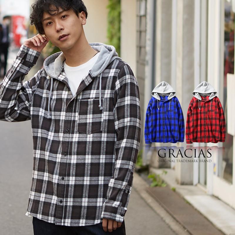 チェックシャツ メンズ 韓国 ファッション フードシャツ フード付きシャツ パーカー チェック柄 長袖シャツ ネルシャツ 赤 黒 Gracias Graciasショッピングストア 通販 Yahoo ショッピング